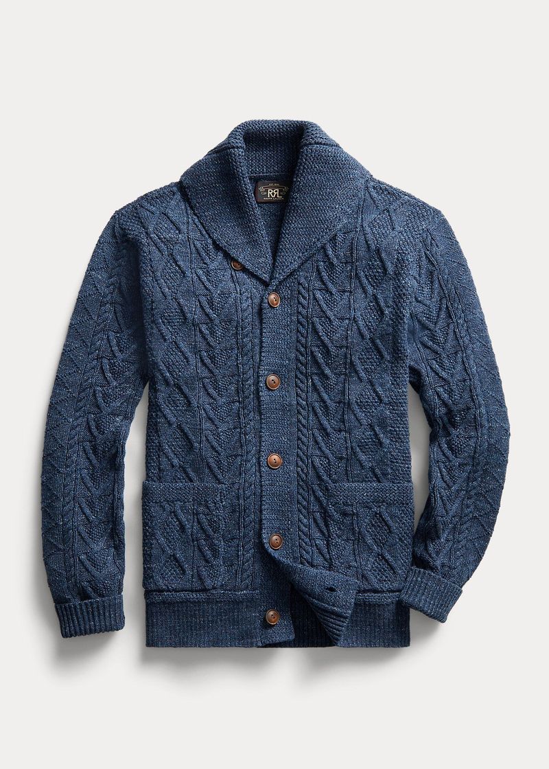 Aran-knit from cotton slub yarn for added texture. Racking stitch details at the collar and placket. Ribbed cuffs and hem. Genuine horn buttons.
